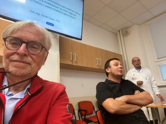 Obr. č. 1 – Moje maličkost, doc. Čegan a doc. MUDr. Pavel Douša, CSc., Klinika úrazové chirurgie a ortopedie FN Ostrava, předseda vědecké rady klastru Czechimplant, v diskuzi nad výsledky projektu