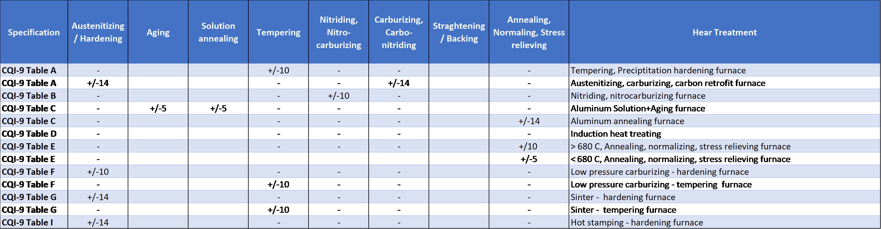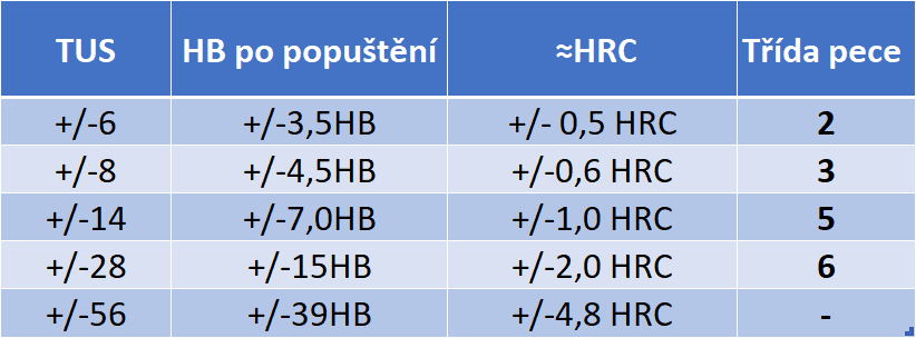 A co říkají normy? Protože popouštění je daleko citlivější na výslednou tvrdost nežli kalení, obvykle je to tak, že pro tuto operaci je předepsána vyšší třída přesnosti pece než pro kalení. Pokud se opět odkážeme na CQI-9 a AMS 2759 1..x, tyto normy předepisují následující třídu pece.