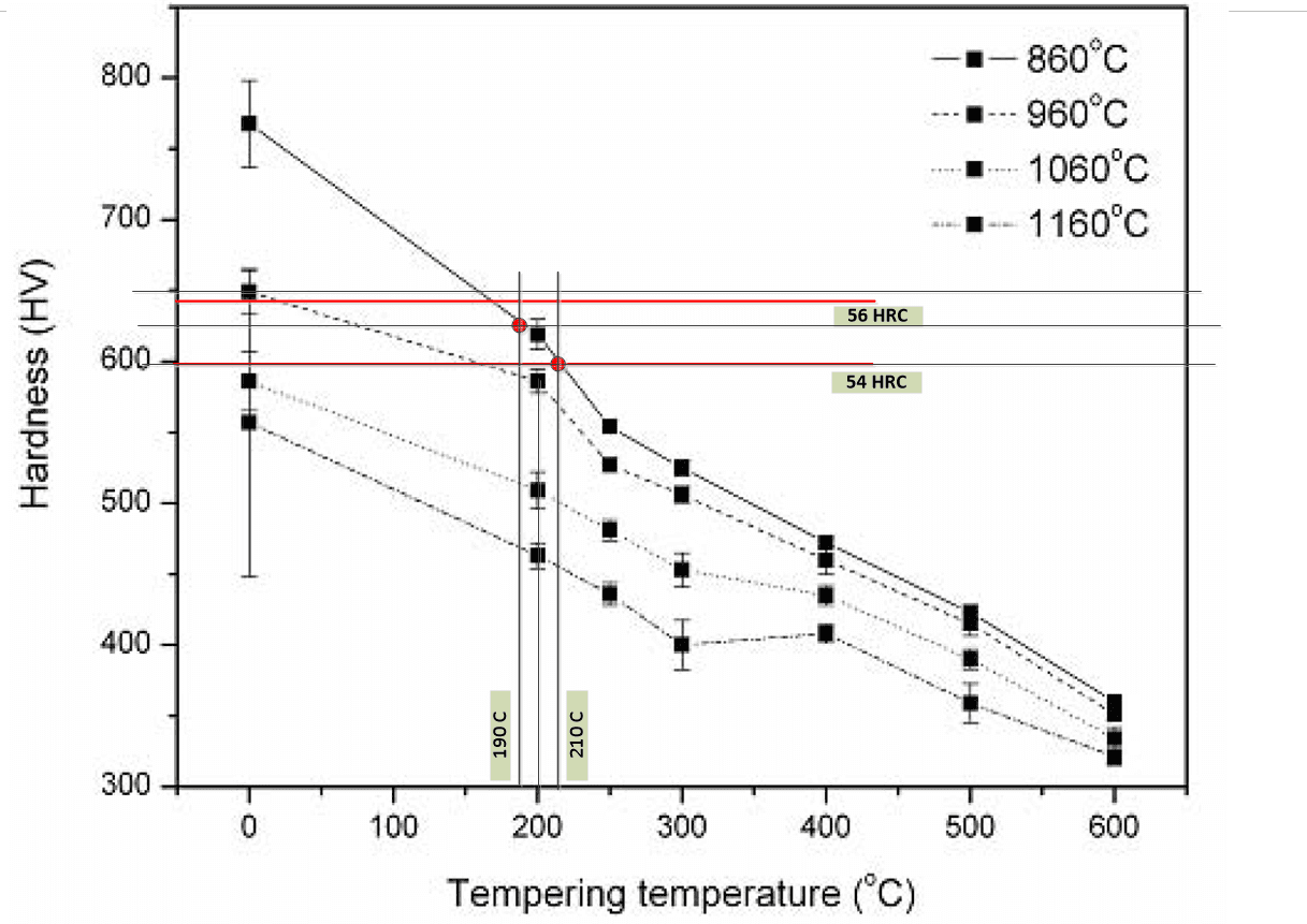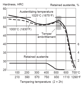 Vliv rovnoměrnosti teploty na výsledek popouštění bude ale pro každou ocel individuální. Čím bude její popouštěcí křivka strmější, tím bude nutná vyšší rovnoměrnost teploty v peci. Např. při popouštění oceli Dievar (Obr. č. 3) na teplotě 600 C budeme mít v peci Class 5, s tolerancí +/- 28 C, rozptyl tvrdosti od 40 do 50 HRc. Pokud budeme mít pec Class 2 (+/- 5 C), pak výsledná tvrdost bude +/- 2 HRc při teplotách v pecí 595 až 605 C.