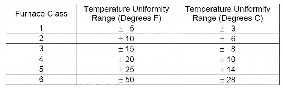 Obr. č. 1 – Tabulka tříd pece dle AMS 2750