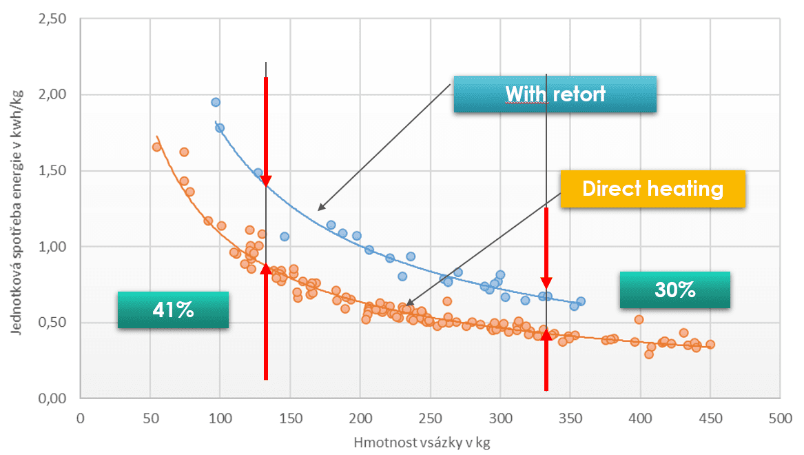 U retortových pecí máme problém, protože s každým cyklem musíme ohřívat a ochlazovat i retortu o hmotnosti stovek kilogramů. Výsledek je na obr. č 14. Z grafu je vidět, že u retorty konzumujeme o 30 až 40 % více energie než u pece s přímým ohřevem. S většími hmotnostmi a delšími časy cyklu se rozdíl ve spotřebě snižuje, nicméně křivky se potkají v nekonečnu. Proto tento typ pece je výhodné používat pro difuzní procesy jako je nitridace nebo karbonitridace, které mají obvykle daleko delší časy cyklu než procesy popouštění, ne ale pro popouštění nebo žíhání. Výjimky ale existují.