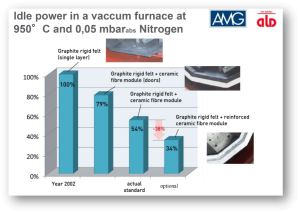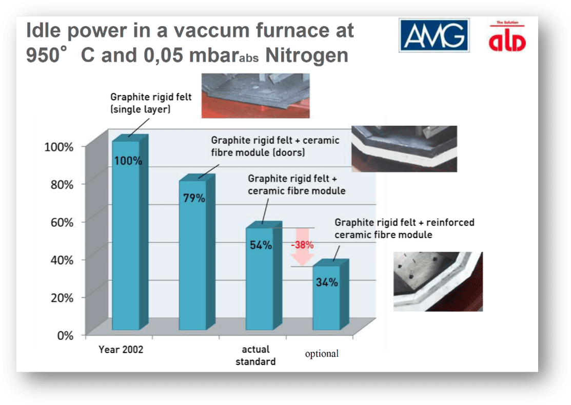 Grafitové izolační materiály jsou trvale vylepšovány, používá se větší tloušťka izolace, vícevrstvá, s povrchem z CFC bránícímu vnější abrazi a s lepší emisivitou. TAV používá pro své popouštěcí a žíhací pece identickou skladbu izolace jako pro pece kalící. To má za následek, že jednak koeficient emisivity povrchu je konstantní, jednak tepelná vodivost izolace je stejně dobrá jak u kalících pecí a jsou tedy i zajištěny všechny podmínky pro nízkou spotřebu energie.