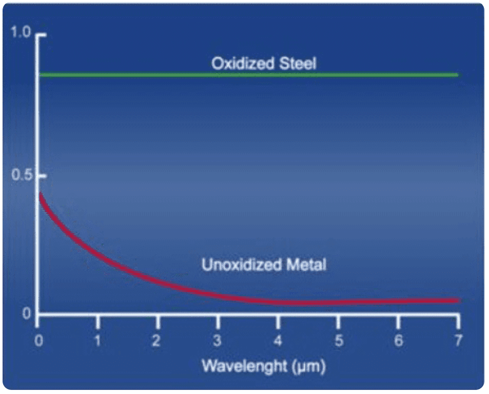 Obr. č. 16 a 17 – Emisivita povrchu různých materiálů a změna emisivity vlivem oxidace [1]