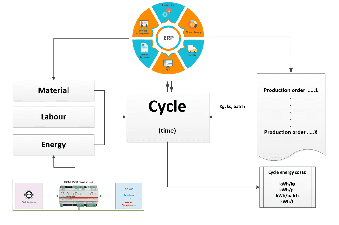 Protože potřebujeme znát spotřebu na výrobní cyklus, pec musí umět přiřadit spotřebované kWh k ID cyklu. ID cyklu nám identifikuje, co jsme v peci dělali. To už je horší, protože abychom spočítali KPI pro spotřebu energie na 1 kg vsázky, musíme vědět, kolik kg jsme v cyklu zpracovávali. To už ale pec neví a je tedy potřeba vybudovat vazbu mezi pecí a ERP systémem. Řešení je více, to už ale popisovat nebudu. To je na investorovi. Orientačně můžeme vyjít z Obr. č. 5.