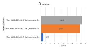 Rozdíl v efektivnosti radiačního tepelného toku je vidět na obr. č. 6. Při zakládání studené vsázky do pece vytopené na 450 °C, tepelný tok z radiace je 5% tepelného toku, který bychom získali zakládáním do pece vytopené na 950 °C.