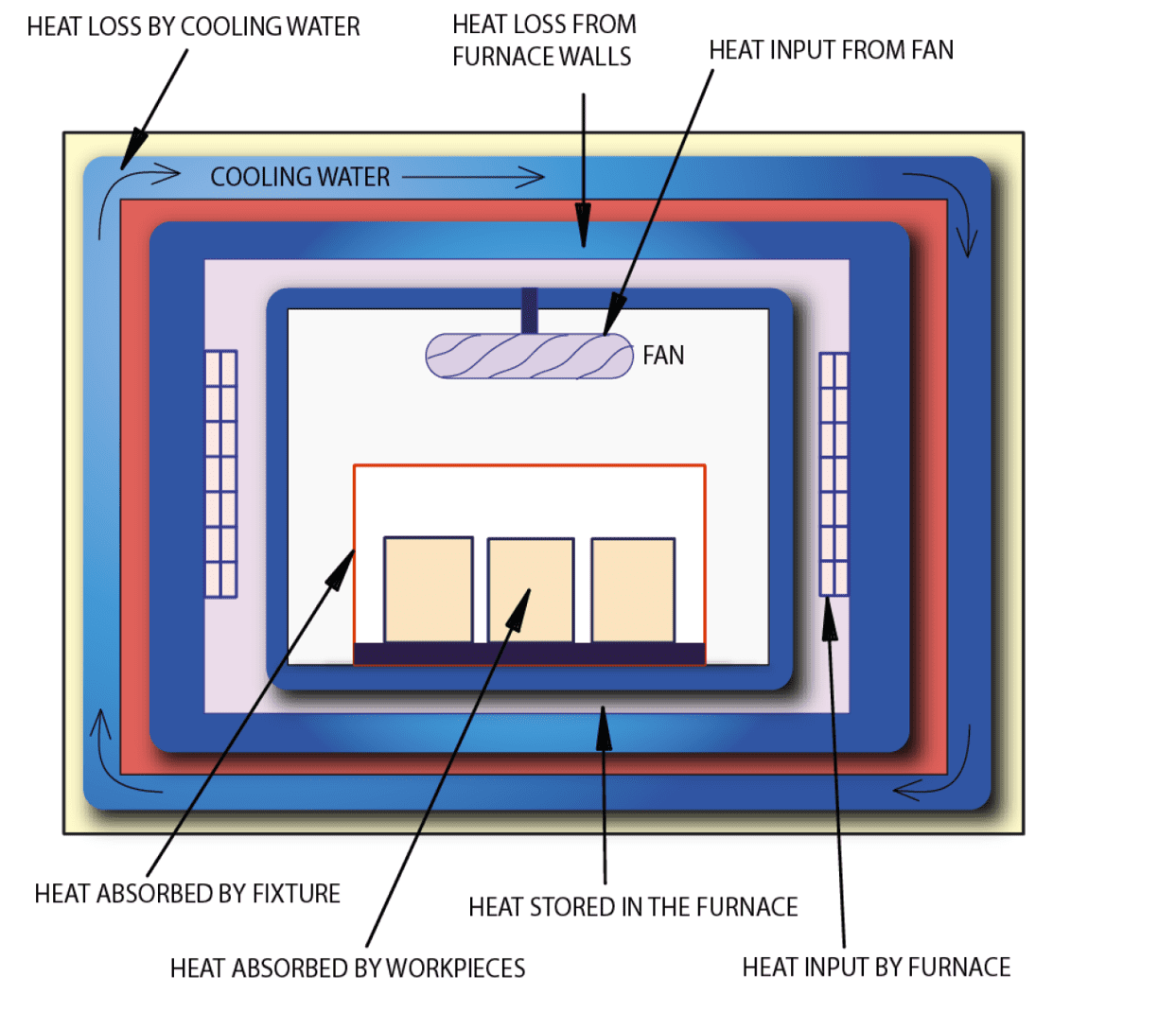 Aby přenos energie byl co nejefektivnější, měl by co nejlépe kombinovat radiační složku a složku konvekční. Protože ale žíhání nebo popouštění probíhá za nízkých teplot, obvykle do 750 °C, pak radiační složka nebude tak významná. Budeme muset tedy dávat akcent na složku konvekce. Vzorec pro hustotu tepelného toku je následující: