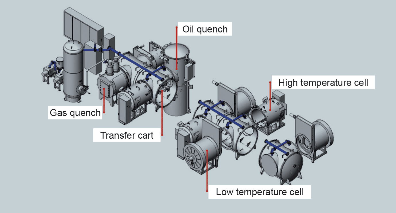 Jedním z nich je systém ECM Flex. Je koncipován horizontálně, s vakuovým přepravním tunelem, a k němu jsou variantně napojeny moduly na cementaci, nitrocementaci, ohřev pro kalení. Moduly kalení jsou buď v proudu plynu do 20 bar, dusík nebo helium, anebo do oleje. Pokud více nechceme, celý vnitřní prostor je na stejném vakuu, jednotlivé komory nejsou vakuově odděleny, ale jsou propojeny.