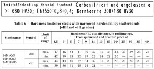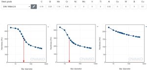 Abychom to posoudili, musíme vyjít z ISO 683-3. Jedná se o hodnoty z Jominyho testu po kalení do vody. Lze ale i použít hodnocení dle ASTM A255, index DI, ideální průměr. Pokud zákazník nemá předepsáno nic, nemusíme mít starosti. Pokud ale má předpis 900-1000 MPa v jádře, nebo min. 300 HV30, nebo 28-32 HRc apod., pak už nás to musí zajímat.