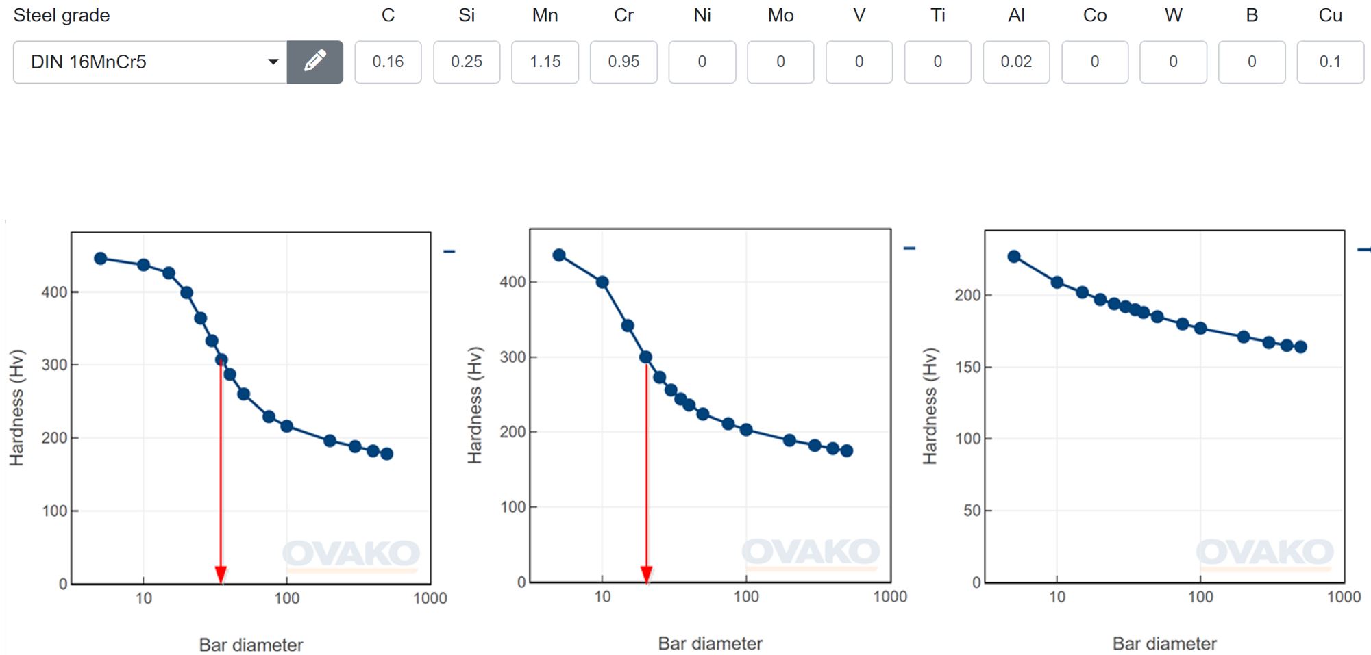 Pro průměrné chemické složení této oceli dle DIN dostáváme hodnoty prokalitelnosti do vody přibližně dia 40 mm, do oleje 20 mm a na vzduchu nikdy. Vypočtená DI hodnota dle ASTM A255 je 1,55. V přepočtu na mm je to dia 38 mm.