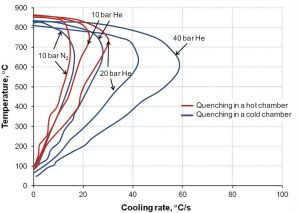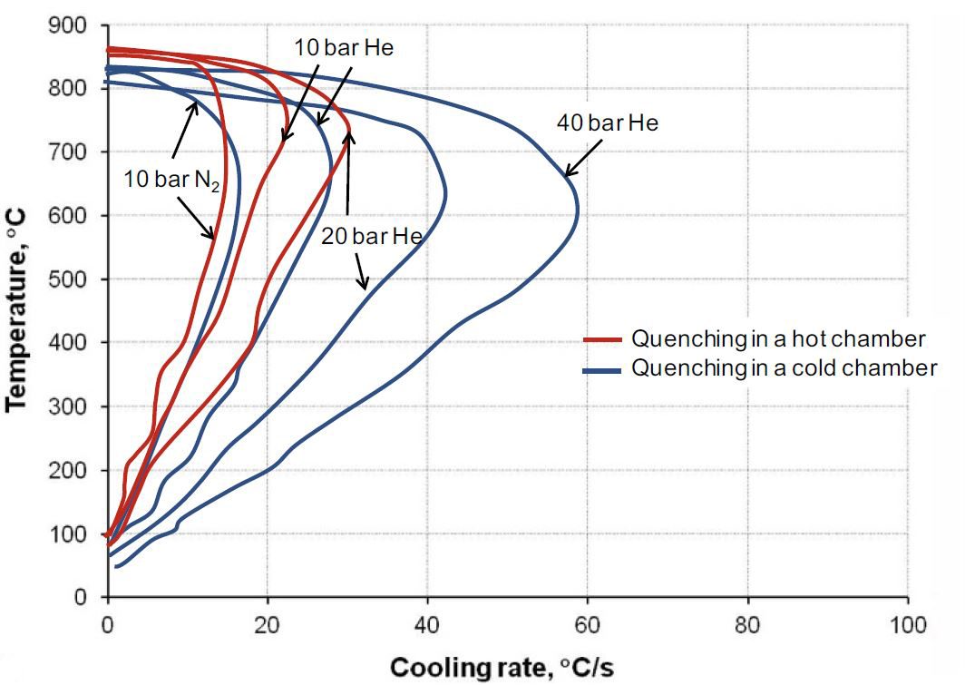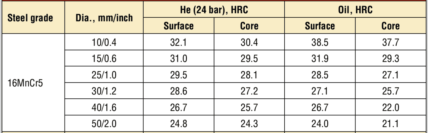 Obdobně lze nalézt data od SecoWarwick [3]. Současně ale SecoWarwick tvrdí, že při 25 bar přetlaku dusíku dosílíme rychlosti ochlazování jako u oleje [4]. Navyšování kalícího tlaku má své limity, a to nejenom technické, ale i legální. Např. v Japonsku lze provozovat pec s maximálním přetlakem do 10 bar, a tento handicap lze překonat pouze kalením do oleje. Z analýzy je vidět, že při kalení do oleje mohu počítat s tvrdostí v jádře > 28 HRc jen do průměru 15 mm, a pokud použiji kalení v helium, tak výsledky mohou být srovnatelné s olejem, použitím kalení dusíku je ale nikdy nedocílím.