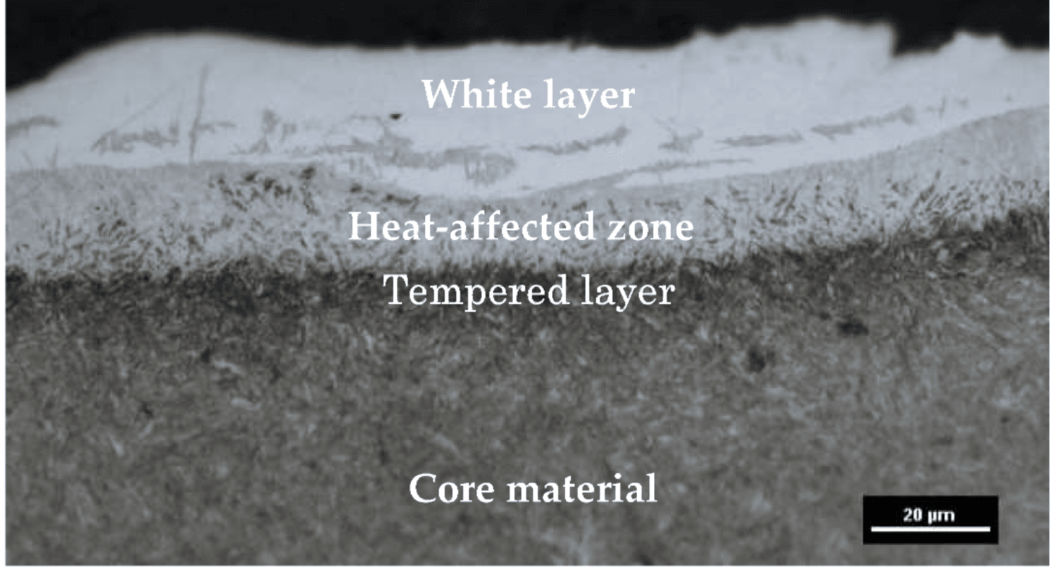 Pokud se provádí EDM po kalení, pak je to sice v pořádku, musíme si ale být jistí, že bílá přetavená vrstva je odstraněna. Obvykle broušením, leštěním, tryskáním. Jak to ale zkontrolovat? Řešení je relativně jednoduché. Bílá vrstva se to nazývá proto, že po naleptání se pod mikroskopem vrstva jeví jako bílá, bez náznaku vlastní struktury materiálu. To je vidět na následujícím obrázku č. 3.