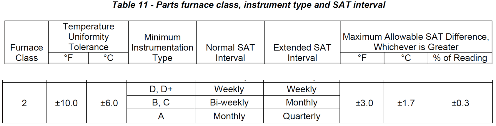 - Interval pro provádění SAT je definován v tabulce č. 11. Pro kalení dílů forem na tlakové lití se musí jednat o pece třídy Class 2, instrumentace B, interval 2 týdny, rozšiřitelný na 1x za měsíc