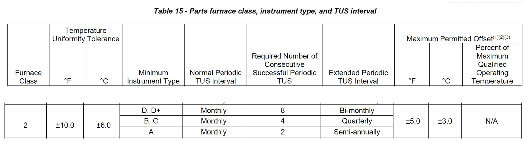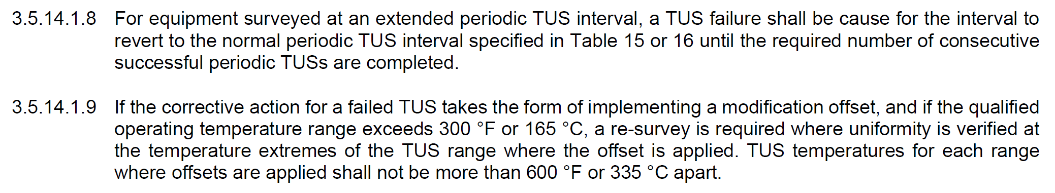- Pokud se aplikuje rozšířený interval pro provádění TUS, neúspěšný výsledek TUS má za následek návrat k původnímu intervalu dle tabulky 15. U standardních vakuových pecí pro kalení dle Nadca 207, rev. 2022 to je případ pece v Class 2, instrumentace B. Základní doba pro TUS je jeden měsíc, rozšířená doba pak čtvrtletně, pokud 4 předcházející TUS měření byly OK