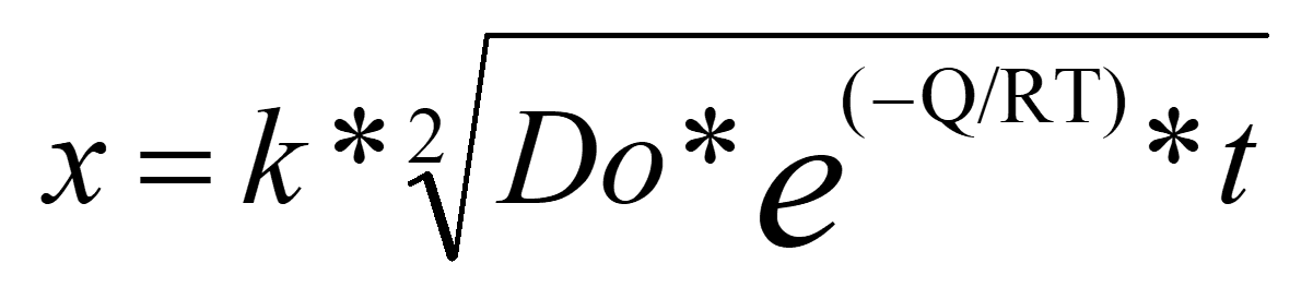 Při výpočtu jsem vycházel z klasické difuzní rovnice, kde D0 je koeficient difuze, Q aktivační energie, R plynová konstanta, T teplota a t čas. Protože nebyl čas, jen jsem tak zkusil použít hodnoty, kdysi mnou počítané pro plasmovou nitridaci a pro difuzi dusíku.