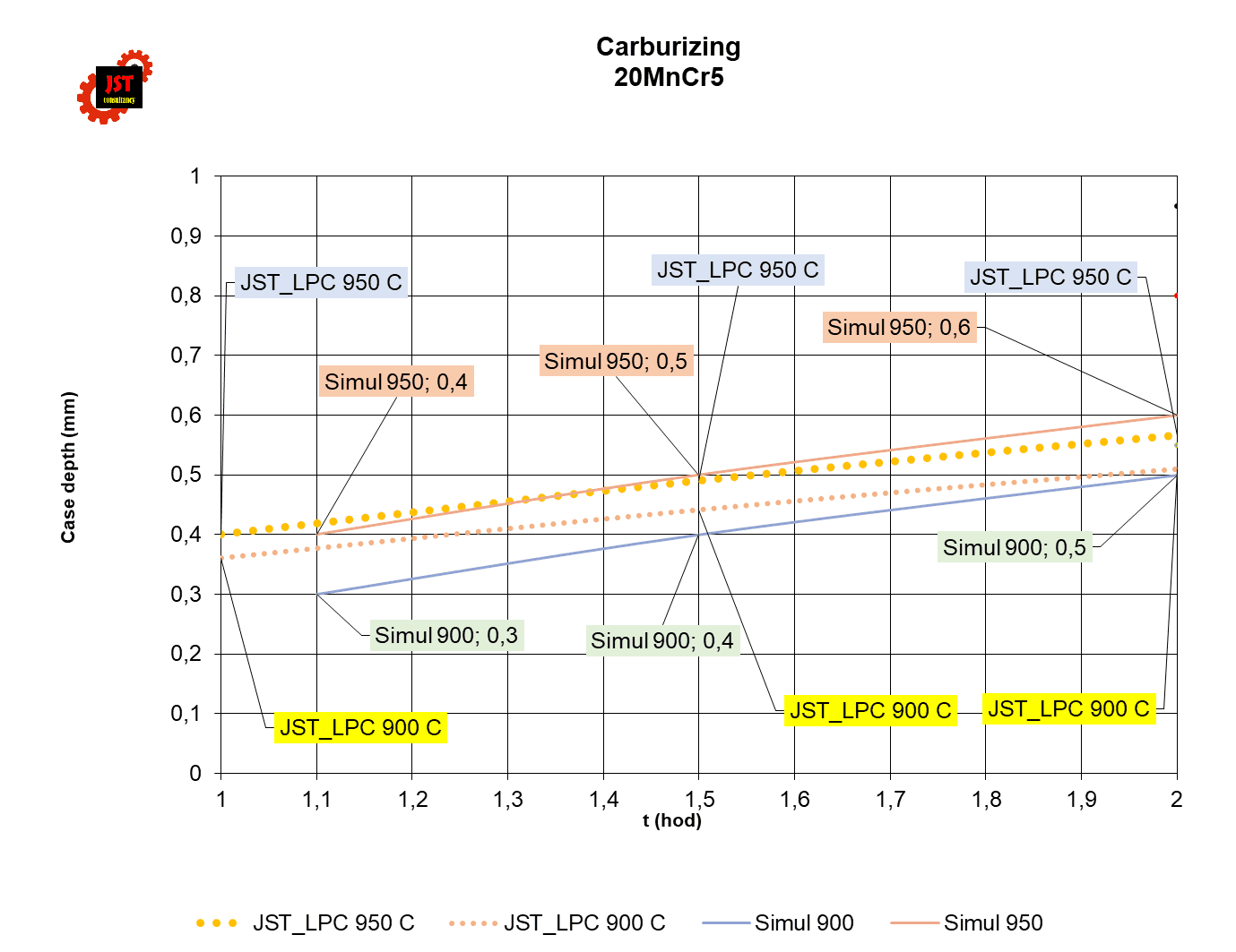 Obr. č. 1 – Hodnoty Simul 900 a Simul 950 jsou vypočteny simulačním softwarem dodavatele pece, hodnoty JST_LPC_900 a JST_LPC_950 pak z mého modelu.