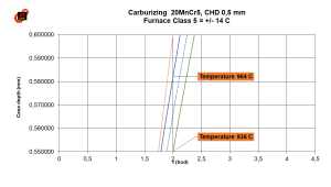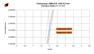 Výsledek mé analýzy je dále. Dle níže uvedeného diagramu, pro třídu pece 2, bude pro teplotu pece 945 °C CHD = 0,561 mm, pro teplotu 955 °C pak CHD = 0,572 mm, tedy 1,96%.