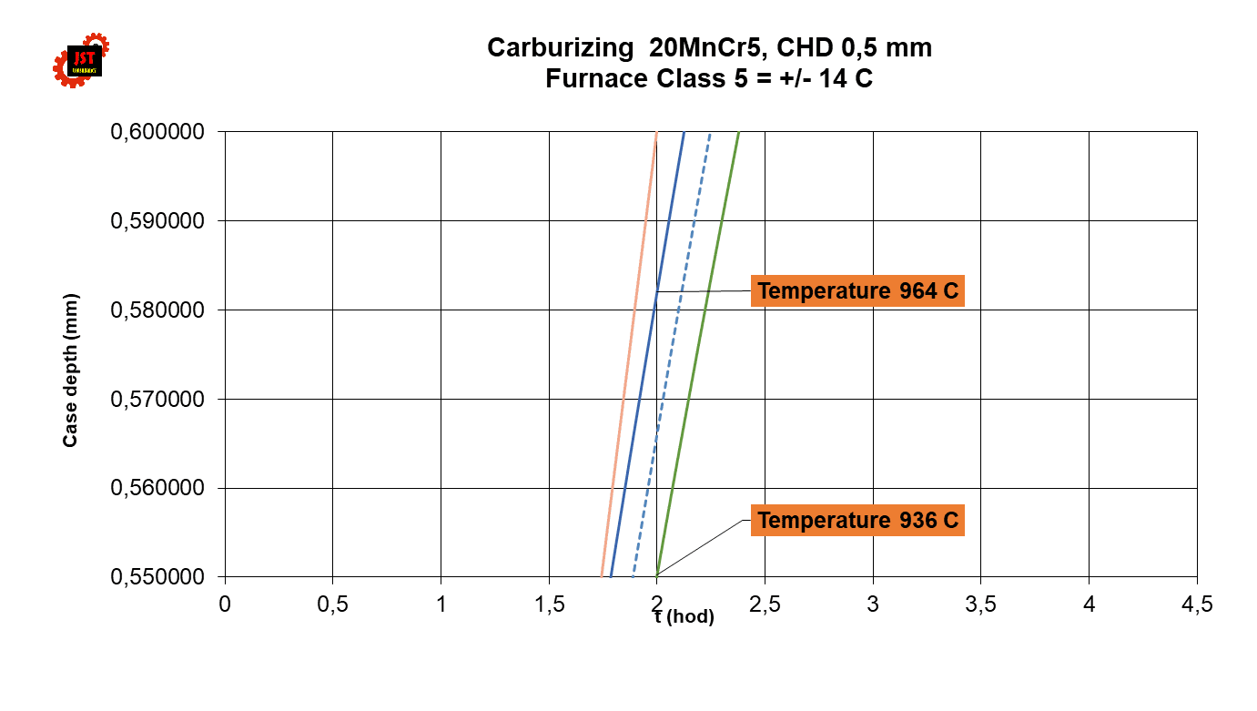 Pro třídu pece 5 pro teplotu pece 936 °C bude CHD = 0,550 mm a pro teplotu 964 °C pak CHD = 0,582 mm. Rozdíl je tedy 5,8%.