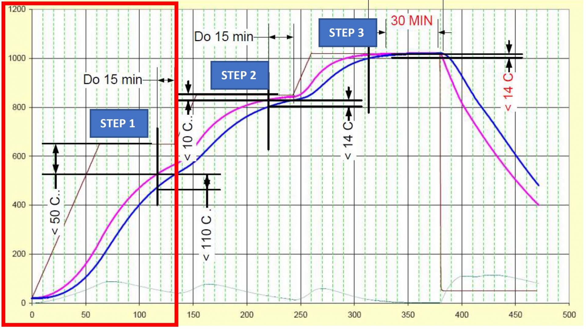 Jaká jsou tedy úskalí ohřevu? Na obr.č. 1 je znázorněn ideální průběh ohřevu dle Nadca 207. Černá čára představuje programovatelnou teplotu pece, fialová teplotu povrchového termočlánku Ts, a modrá pak termočlánek Tc, měřící teplotu v jádře vložky.