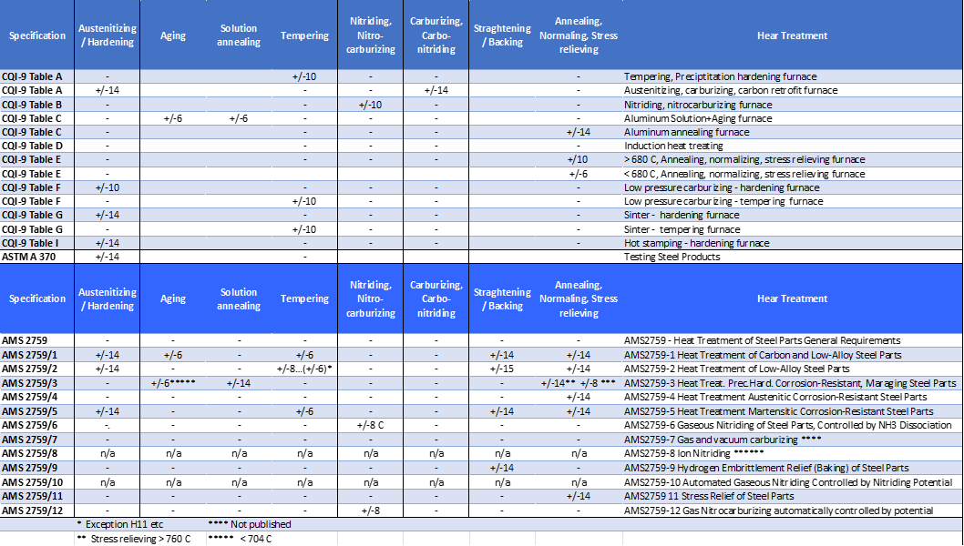 This table shows the required tolerances according to various AMS 2759 standards and according to CQI-9.