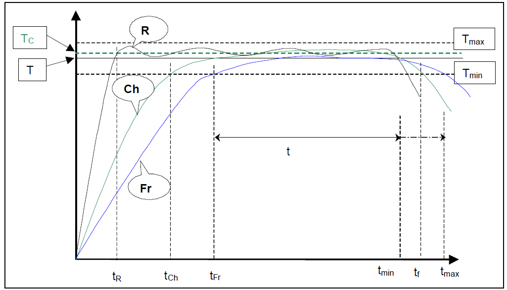Since the thermocouple measuring the temperature in the core, Tc (C – Core), will always be the coldest, if a temperature hold time is prescribed, it will begin when TC crosses the SP-TC line < ½ the tolerance field. Therefore, if we temper according to AMS 2759/1, the temperature tolerance is +/- 6 °C and the time countdown occurs when the TC temperature crosses the SP- 6 °C line.