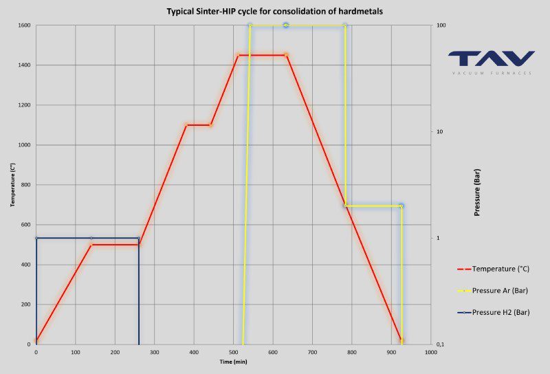Sinter-HIP je často preferován nejen pro praktičnost a hospodárnost kombinace dvou procesů v jednom, ale také pro zamezení nadměrného růstu zrn, který je někdy spojen s post-sinter HIP. Typický cyklus Sinter-HIP pro slinutý karbid je znázorněn na následujícím obrázku ; v tomto konkrétním případě cyklus také zahrnuje počáteční krok odparafínování ve vodíkové atmosféře.
