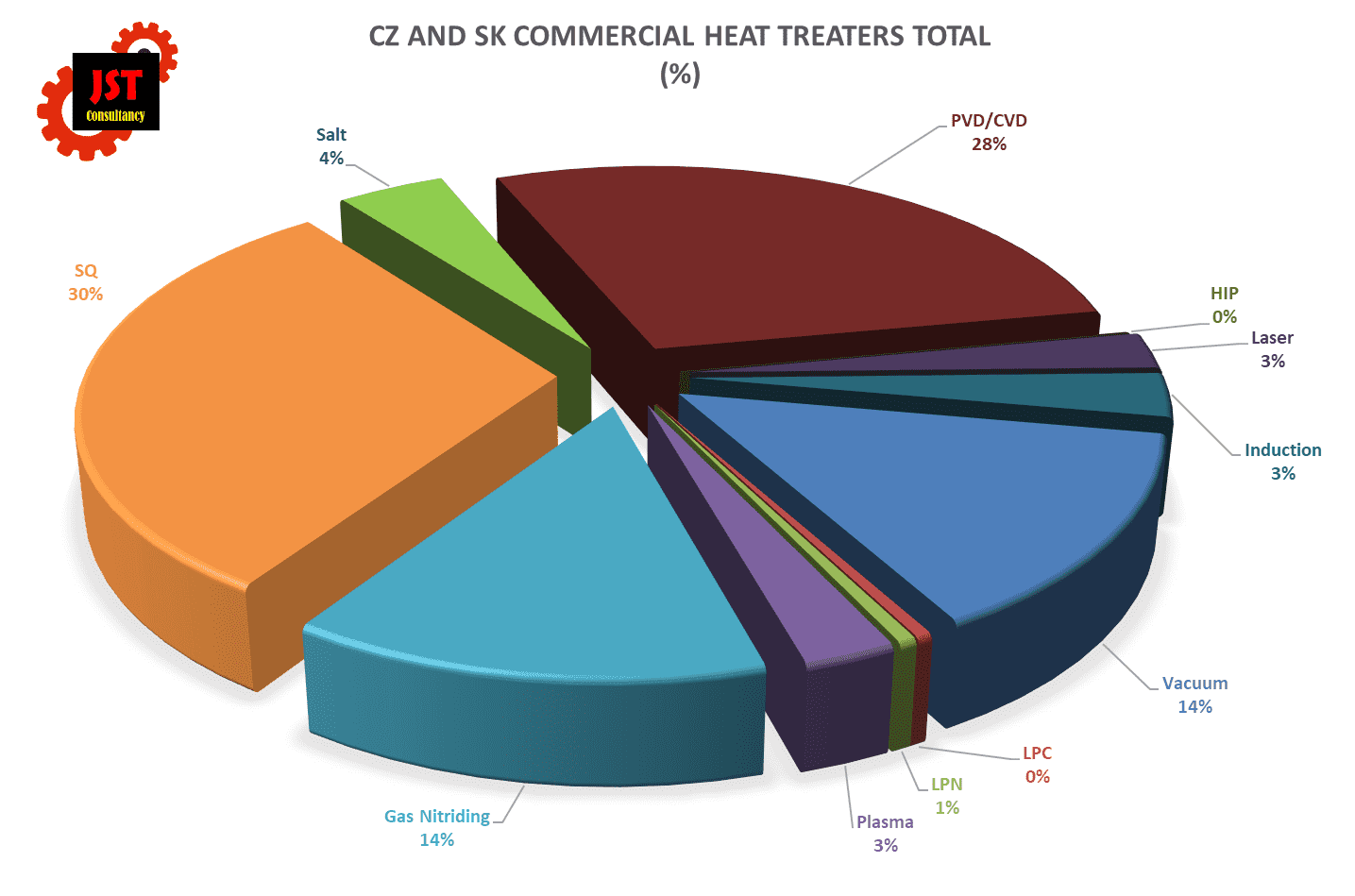 Z hlediska klasického tepelného zpracování i nadále dominuje SQ, následuje nitridace/karbonitridace v plynu, a vakuum. Překvapivé je postavení LPC, kde jsme do 1%. U in-house kalíren je tato technologie velmi dobře zastoupená díky linkám ECM v Bosch Jihlava a Poclain Hydraulics, nebo od ALD v Škoda-Auto Mladá Boleslav a Vrchlabí. U komerčních kalíren je to ale horší, investice do 15bar pece od SecoWarwick nedává možnost přechodu z SQ na LPC, a tudíž tyto pece jsou většinou využity na standardní kalení, ne na nízkotlakou cementaci.