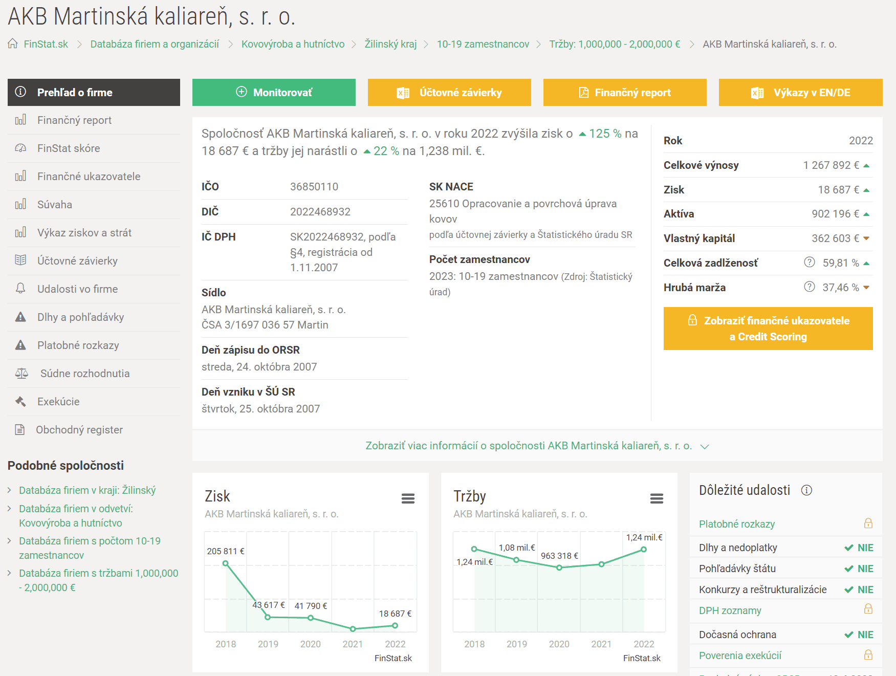 Je to veliká věštírna, protože pouze komerční firmy mají v účetní uzávěrce čísla o prodeji tepelného zapracování. U ostatních se jedná o velice hrubý odhad. Druhým problémem je, že v CZ je sice povinnost publikovat údaje v Obchodním rejstříku, pro malé firmy ale toto platí jen ve zkrácené verzi. Proto řada kalíren má v OR jen rozvahu, ne Výkaz zisku a ztrát. Na Slovensku je situace podstatně lepší, protože data jsou předávána v jednotné a úplné elektronické podobě, a není pak problém mít data okamžitá aktuální: https://finstat.sk/, viz např. níže uvedený výpis.
