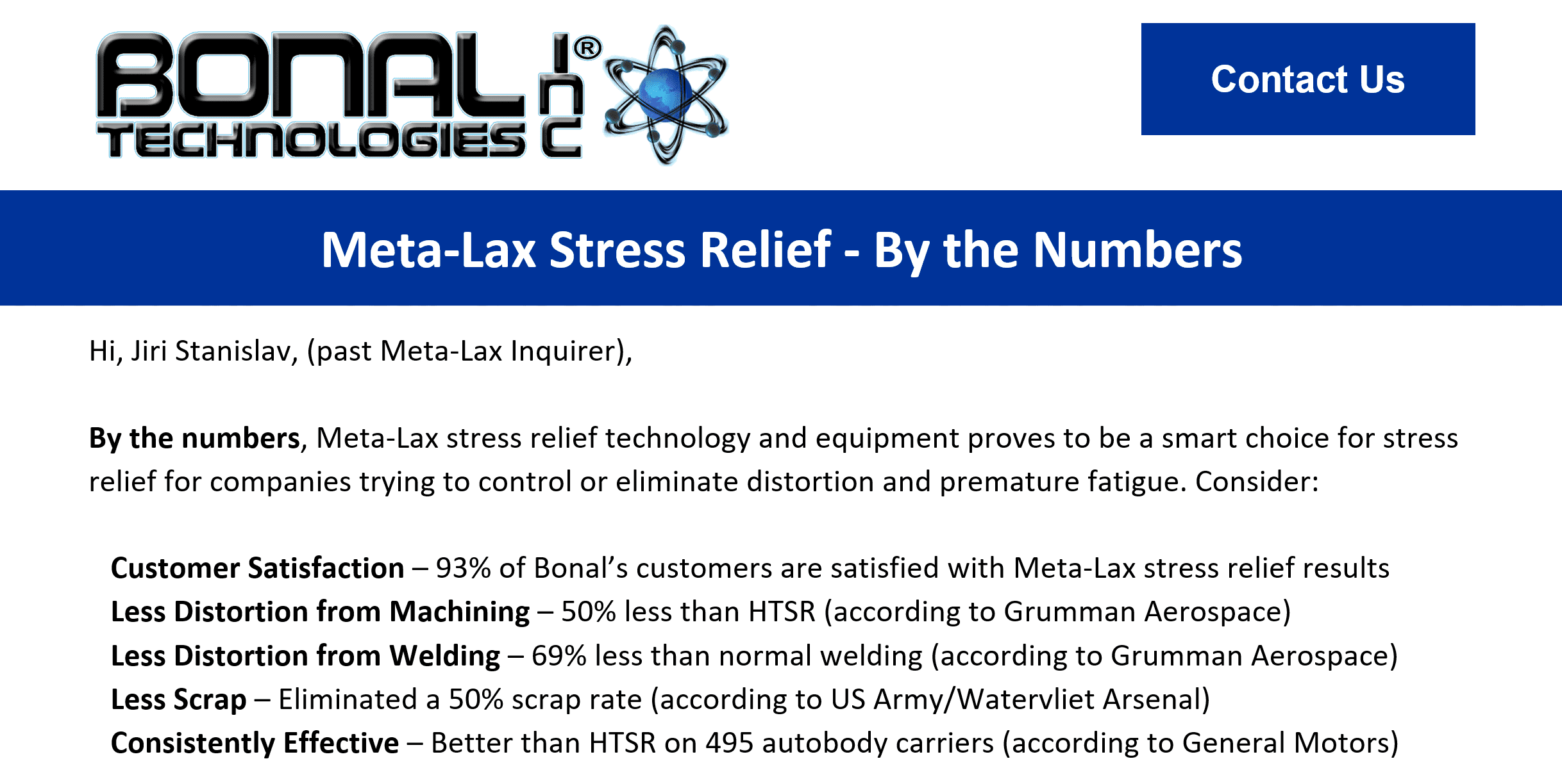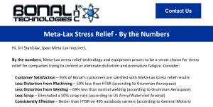 Podle firmy Bonal Technologies, aplikací tohoto způsobu žíhání na díly z obrábění byly výsledky zlepšeny o 50%, v případě svařenců o 69%. Celkově byla snížena zmetkovitost o 50%. Přitom tato metoda uspoří 62 až 95% nákladů na žíhání, a 50% až 95% času. V dnešní době hledání energetických úspor je to na zvážení, minimálně to odzkoušet. Firma Bonal nabízí zařízení Meta-Lax za 337,55 USD/měsíčně.